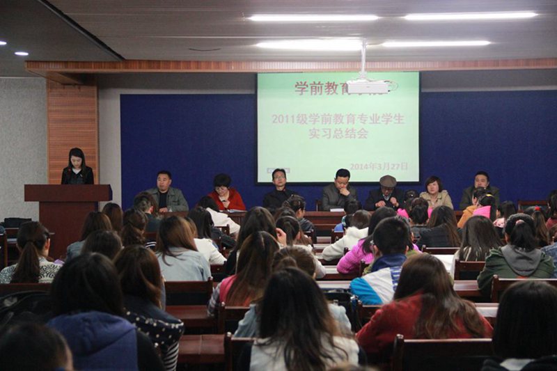 3月27日晚上八时,为了总结11级员工一年来实习经验和巩固实习成果,表彰在实习中表现突出成绩优异的员工,太阳成集团tyc11级学前教育员工实习总结表彰大会在老员工活动中心举行。 公司领导、辅导员、科室负责人、11级全体员工及特邀嘉宾督导室王轶才主任、小橡树幼儿园园长张静共400人参加了会议, 会议由公司党总支负责人张永明教授主持。