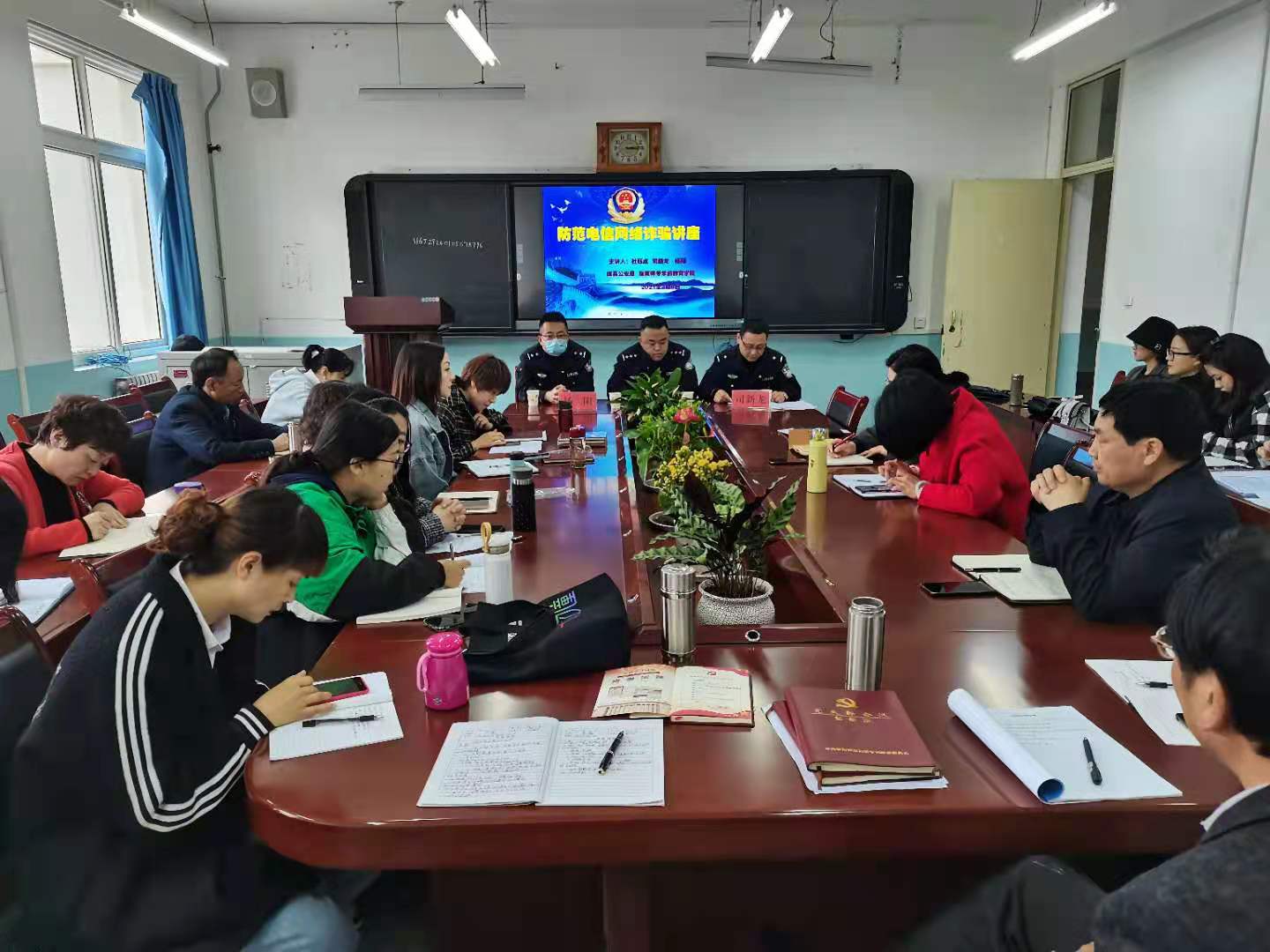 月6 日下午三点,太阳成集团tyc与成县公安局联合举行安全校园建设活动,邀请成县公安局刑警队杜钰成、司新龙、杨阳三位警官给公司师生举行“预防电信诈骗”专题讲座,会议由公司党总支书记李霞主持,全体教师和各班员工代表共同参加。