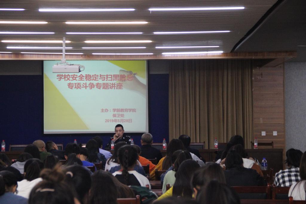 刑警大队副大队长胡立芳作题为《扫黑除恶,共建和谐校园》的发言。胡副队长谈到扫黑除恶活动是在2018年1月中共中央、国务院发出《关于开展扫黑除恶专项斗争的通知》。《通知》指出,为深入贯彻落实党的十九大部署和习近平总书记重要指示精神,保障人民安居乐业、社会安定有序、国家长治久安,进一步巩固党的执政基础,党中央、国务院决定,在全国开展扫黑除恶专项斗争。本次活动旨在进一步营造扫黑除恶专项斗争浓厚宣传氛围,推进平安校园建设,提高在校老员工对校园扫黑除恶专项斗争的认知度,预防和遏止青年老员工参与黑恶势力及遭受黑恶势力侵害