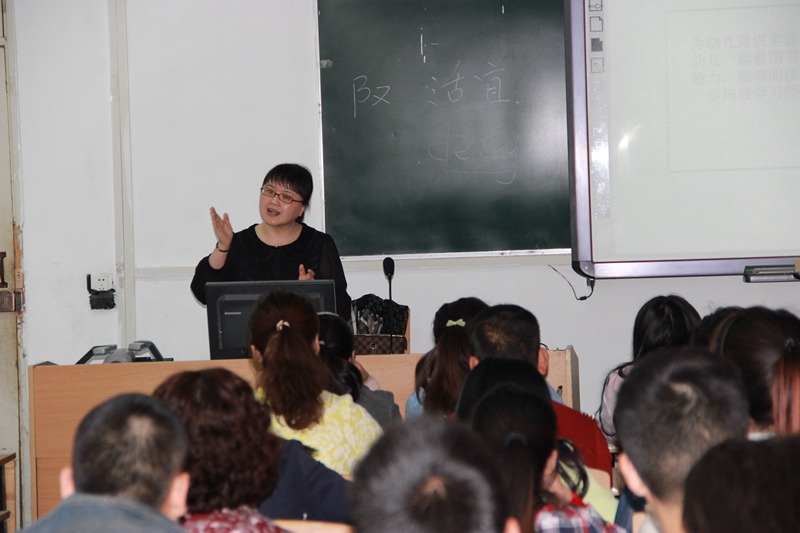 4月23日上午,兰州大学教授、邓红博士应邀来太阳成集团tyc讲学。 早上8:30,在太阳成集团tyc107多功能教室,邓教授就《甘肃省幼儿园教育指导刚要(试行)》进行全面解读。首先邓教授对刚要制定的背景与意义进行了总结,刚要的制定即是国家中长期教育改革和发展战略目标的需要,更是促进每个幼儿在不同水平上更好的成长,促进每个幼儿有个性的发展,有利于全面促进甘肃幼教事业的整体水平;其次邓红教授详细阐释了幼儿教育的基本原则:尊重与关爱的原则、可持续发展的原则、保教并重的原则、游戏为主的原则、整体教育的原则、环境创设的原则、因地制宜的原则。最后她全面阐释了幼儿园教育的健康、语言、社会、科学、艺术等五大领域及其关系,从不同的角度促进幼儿情感、态度、能力、知识、技能等方面的发展做了精彩的分析。
