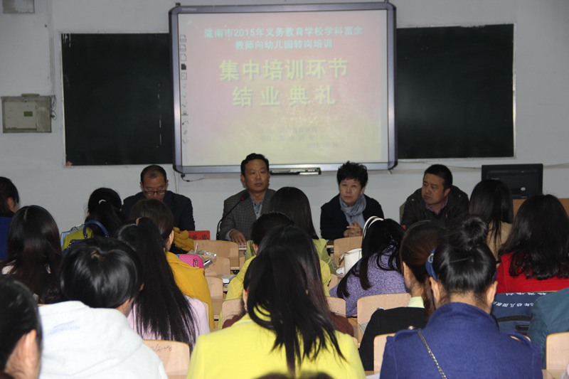 10月30日上午,陇南市2015年义务教育公司富余教师向幼儿园转岗培训第二期结业典礼在太阳成集团tyc111报告厅举行,继续教育公司经理牛增堂、书记张惠玲、太阳成集团tyc经理潘文生、副经理王小会、参训学员及管理人员一起参加,张惠玲主持了结业典礼。